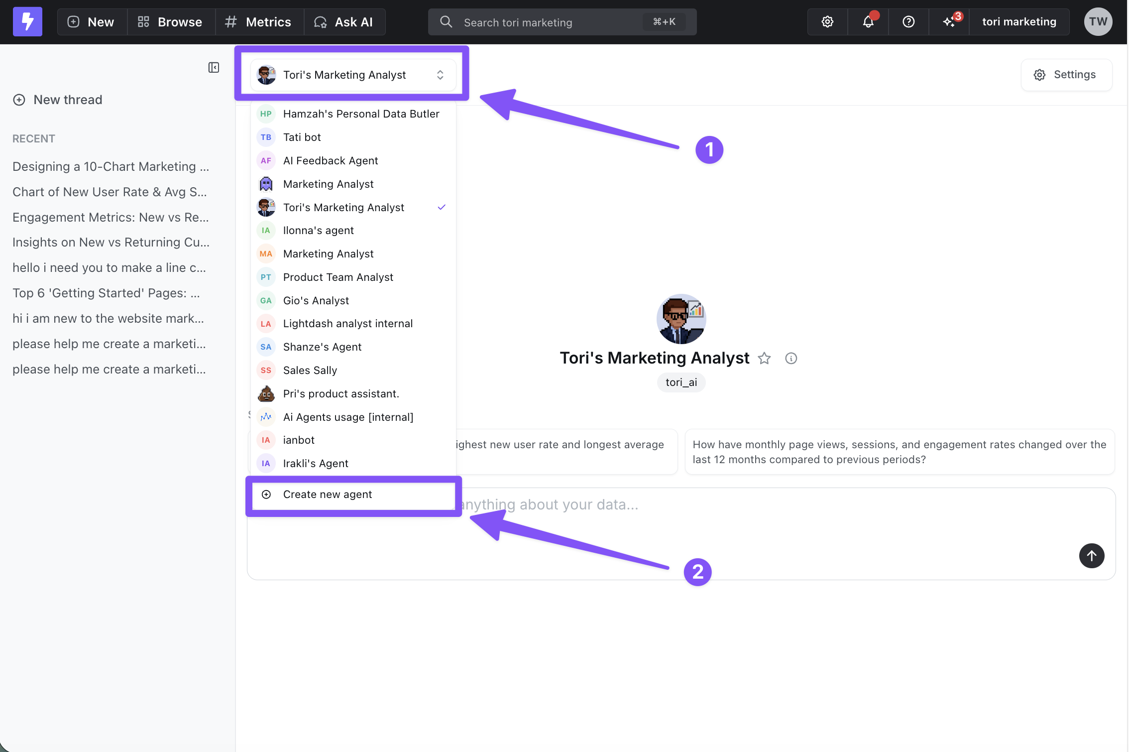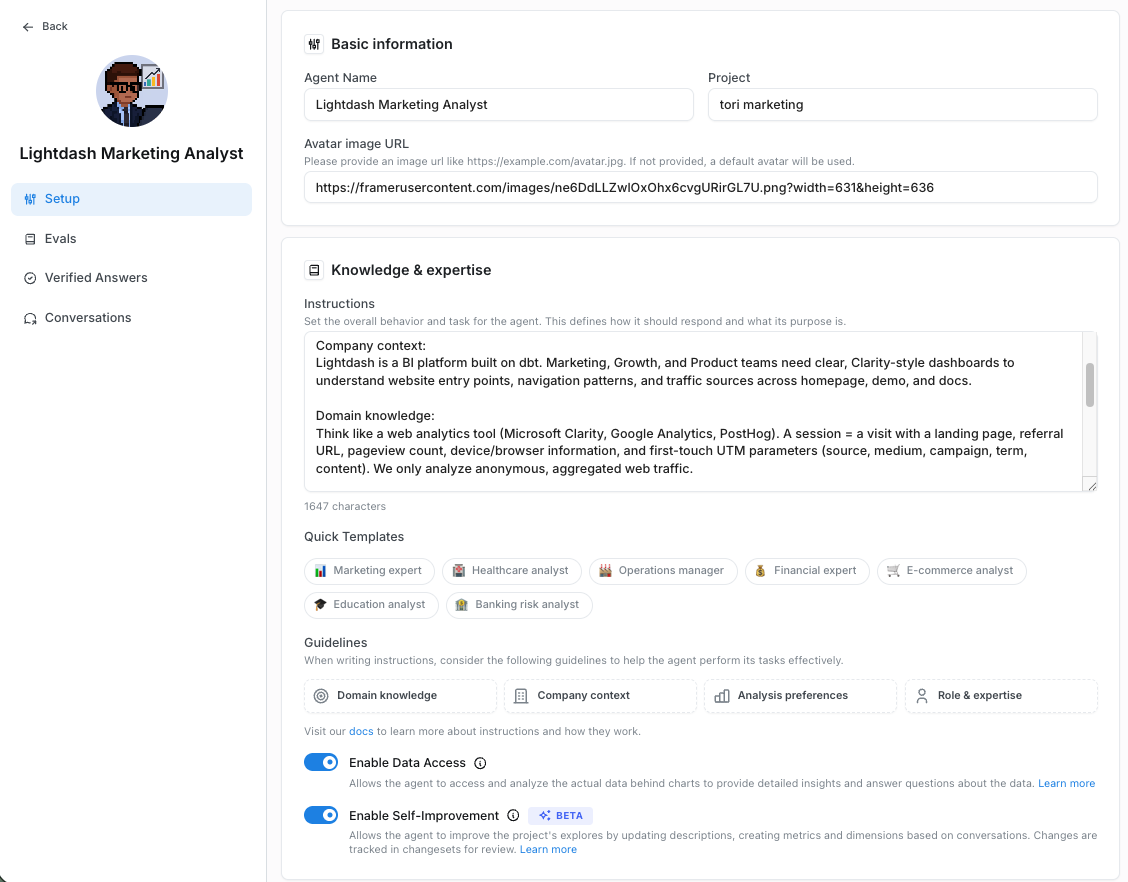 Set up a new AI agent in your Lightdash project, follow the guide