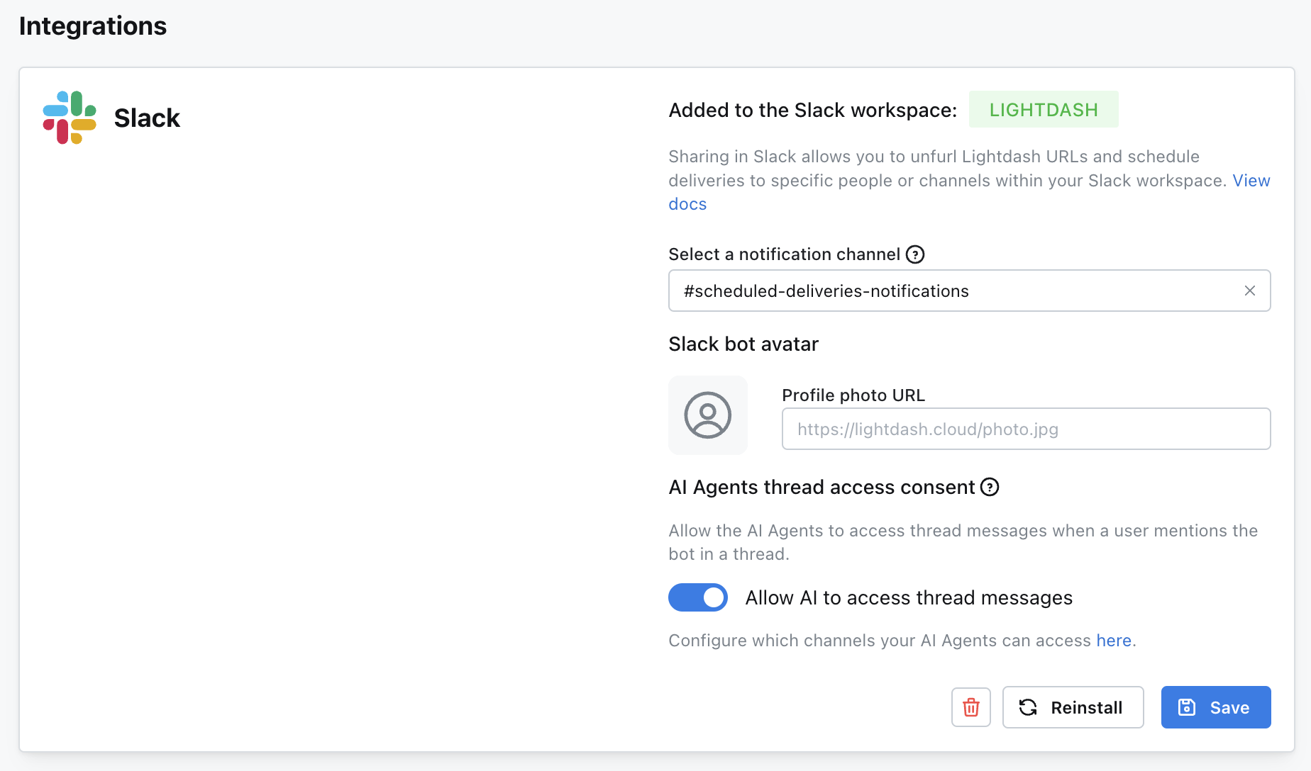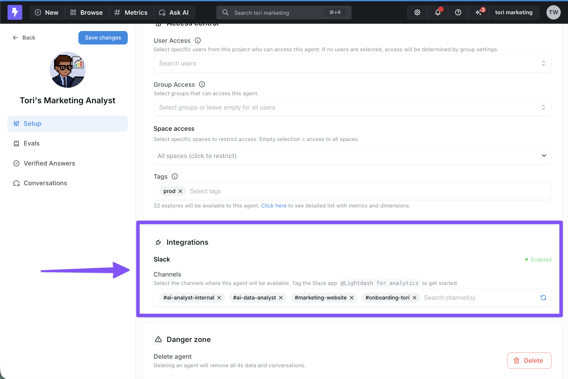2. Add the desired slack channel to your agent integration settings.