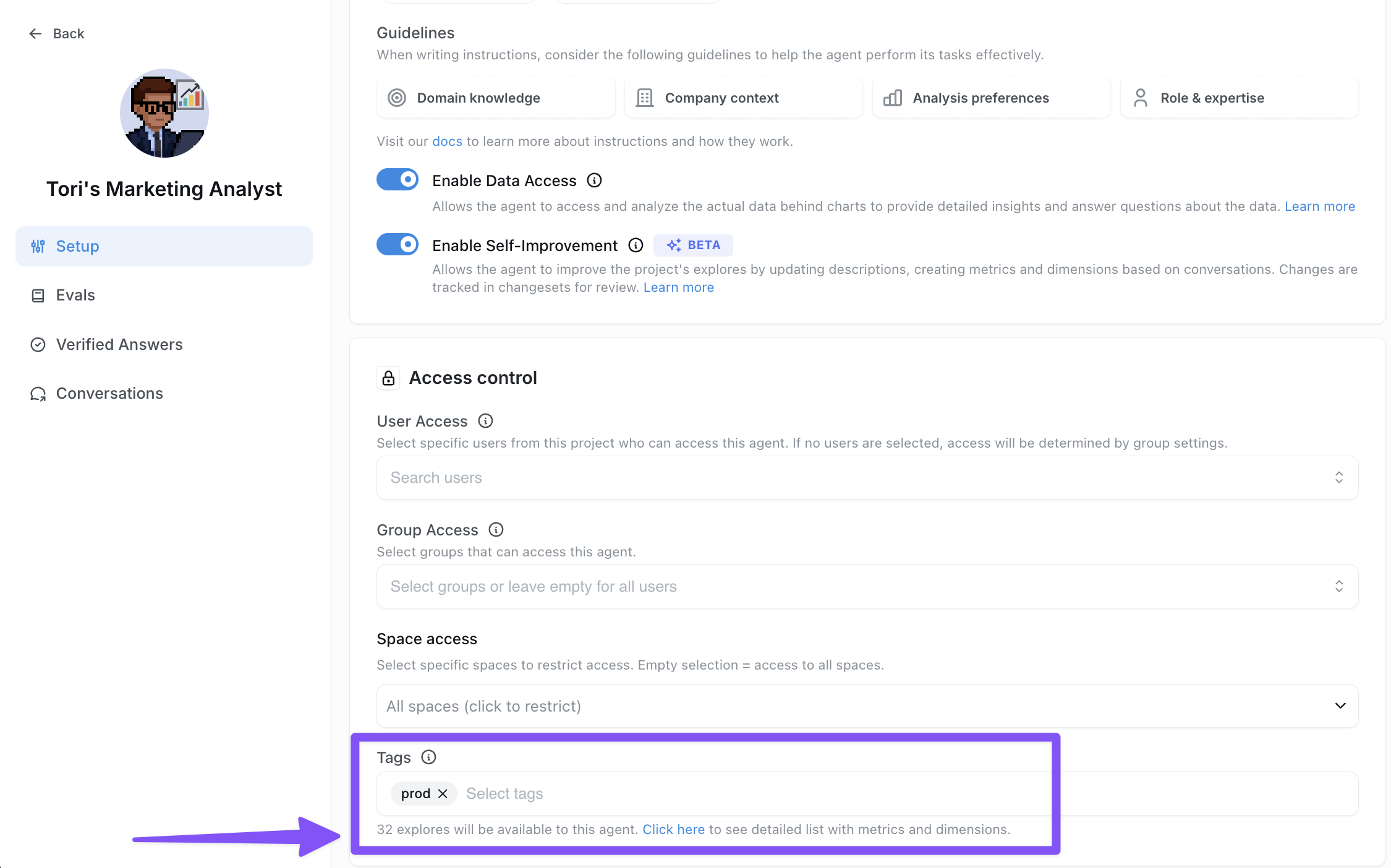 1. Tag your dbt model dimensions and metrics with the tags you want - your agent will only have access to those dimensions or metrics that have matching tags.