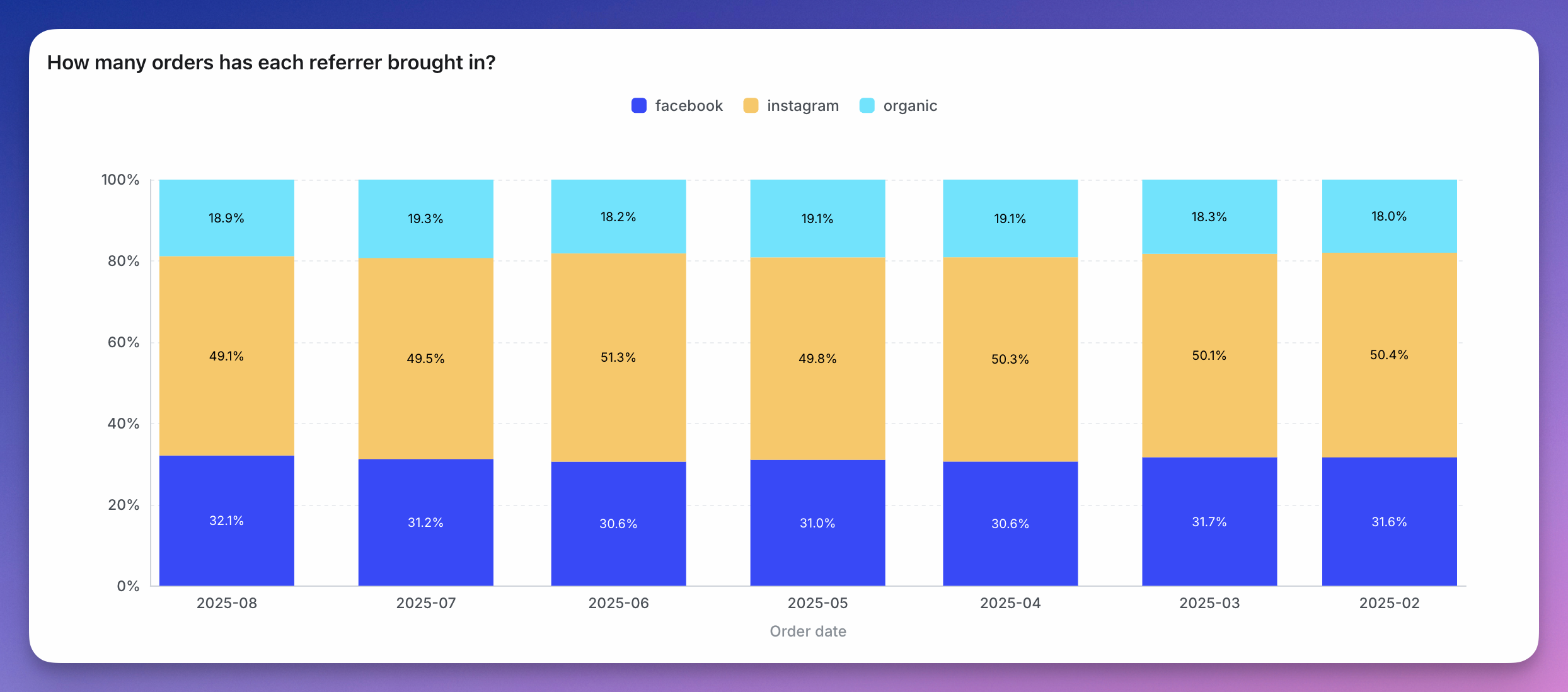 You can easily create 100% stacked bar charts easily by just selecting the 100% stacking option on the chart configuration. After enabling this option, we will automatically transform the data and the axes to display a 100% stacked bar chart. download.png 100% Stacked Bar Charts are useful when you need to visualize how the composition of a metric changes over time, or how the composition changes across different groups.