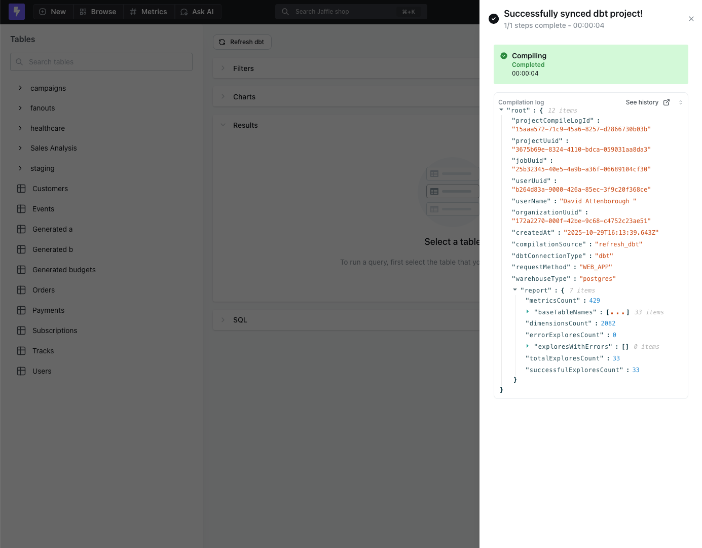 When you use the Refresh dbt button in the UI, the compilation log is displayed as the job finalizes. After the refresh completes, you can view the full compilation details directly in the job notification.