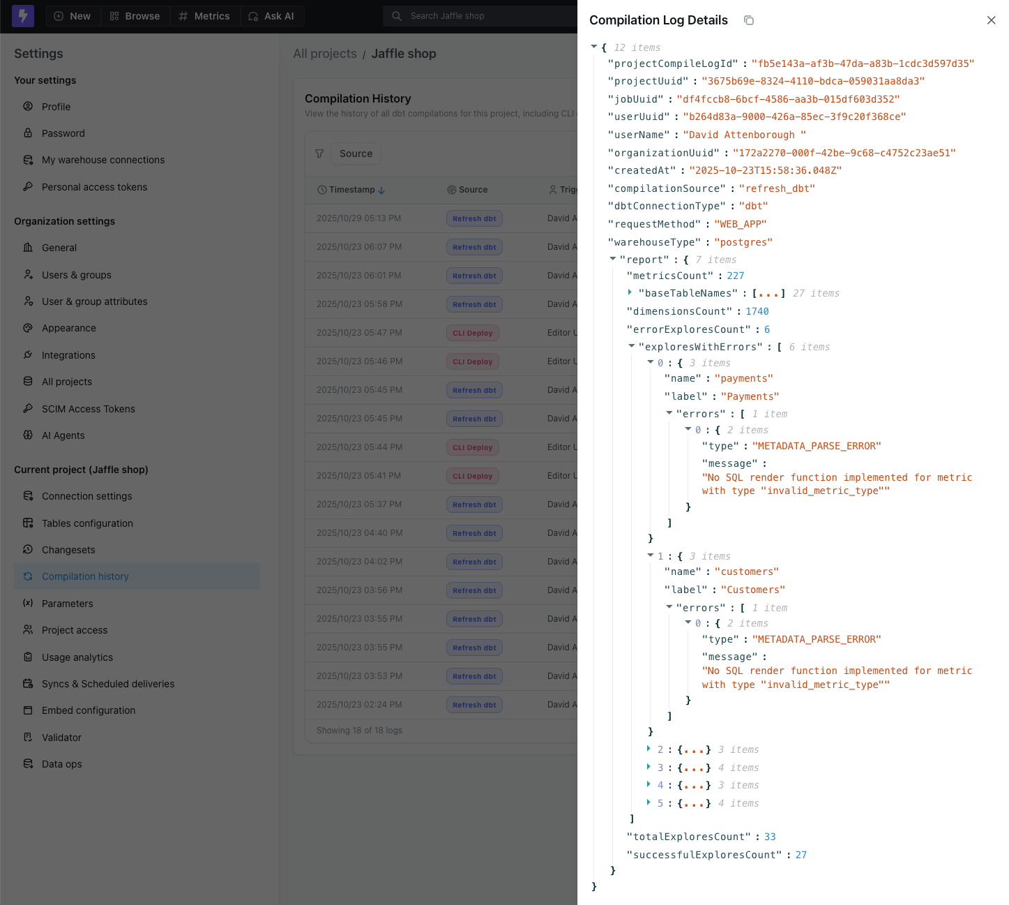 Project compilation logs provide a comprehensive history of when your Lightdash project was compiled, allowing administrators and project managers to monitor project changes, track deployments, and identify any compilation issues.
