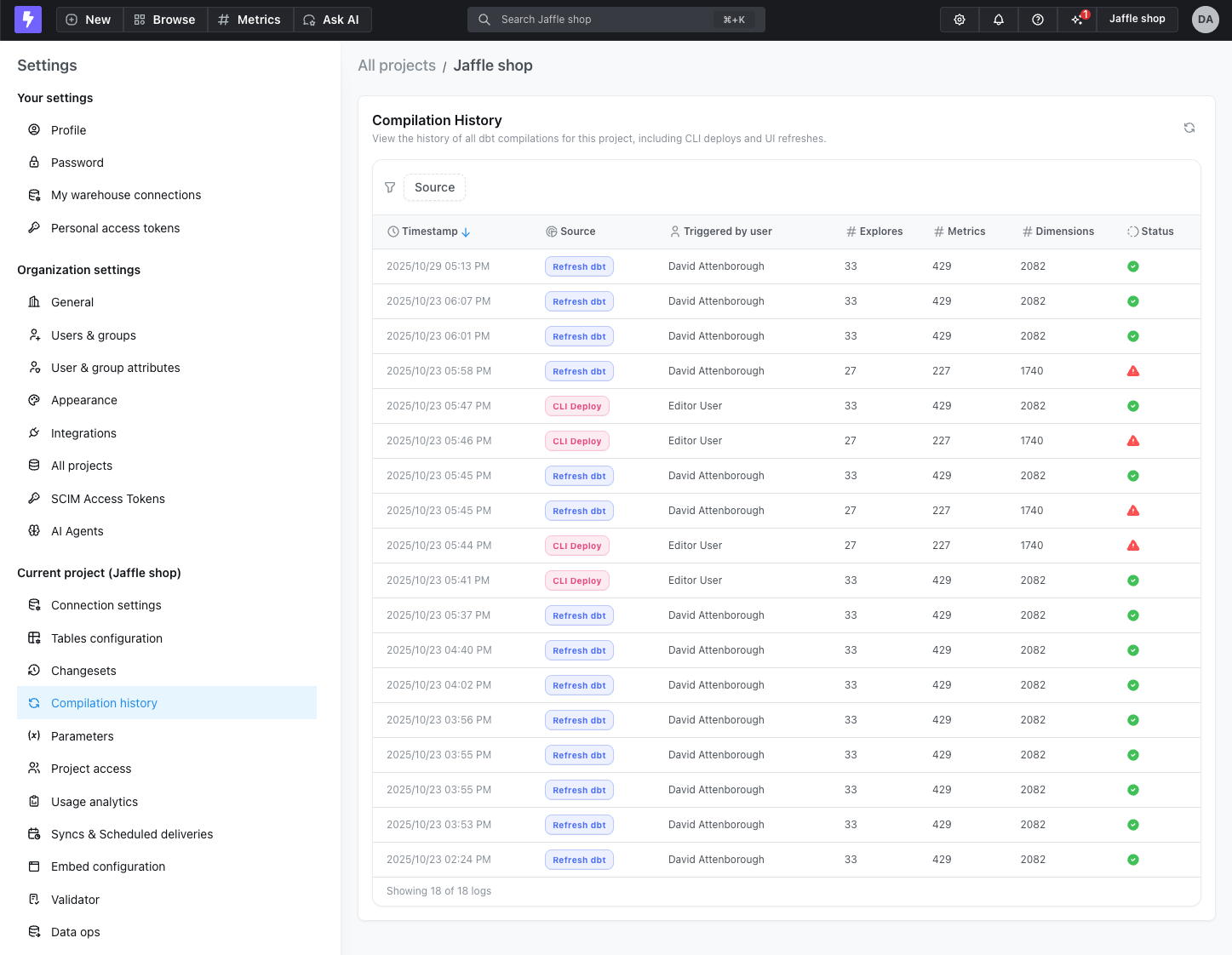 The compilation history displays a list of all project compilations, showing when each compilation occurred, who triggered it, and the source (such as Refresh dbt, CLI Deploy).